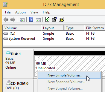- Create a partition on the virtual drive. Click the unallocated space using the right mouse button and select