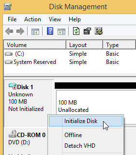 - Initialize the new virtual drive. Click the new disk icon using the right mouse button and select