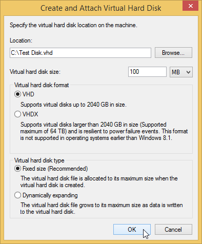 - Create a new virtual disk file (VHD). Open the